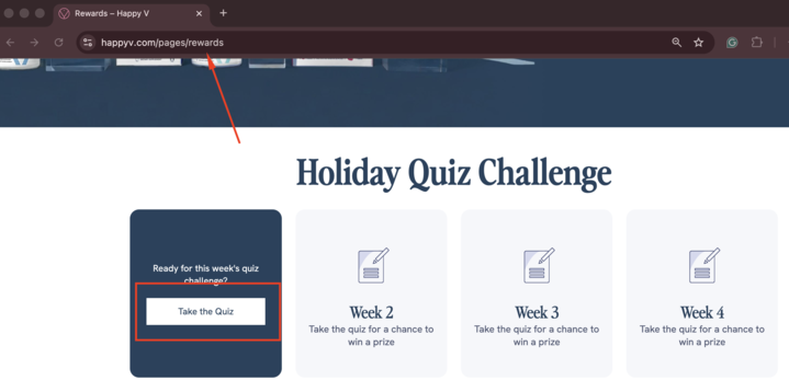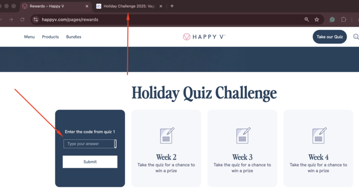 If you are participating in our Holiday Quiz Challenge, please follow these steps to access the quiz and successfully enter your redemption code: